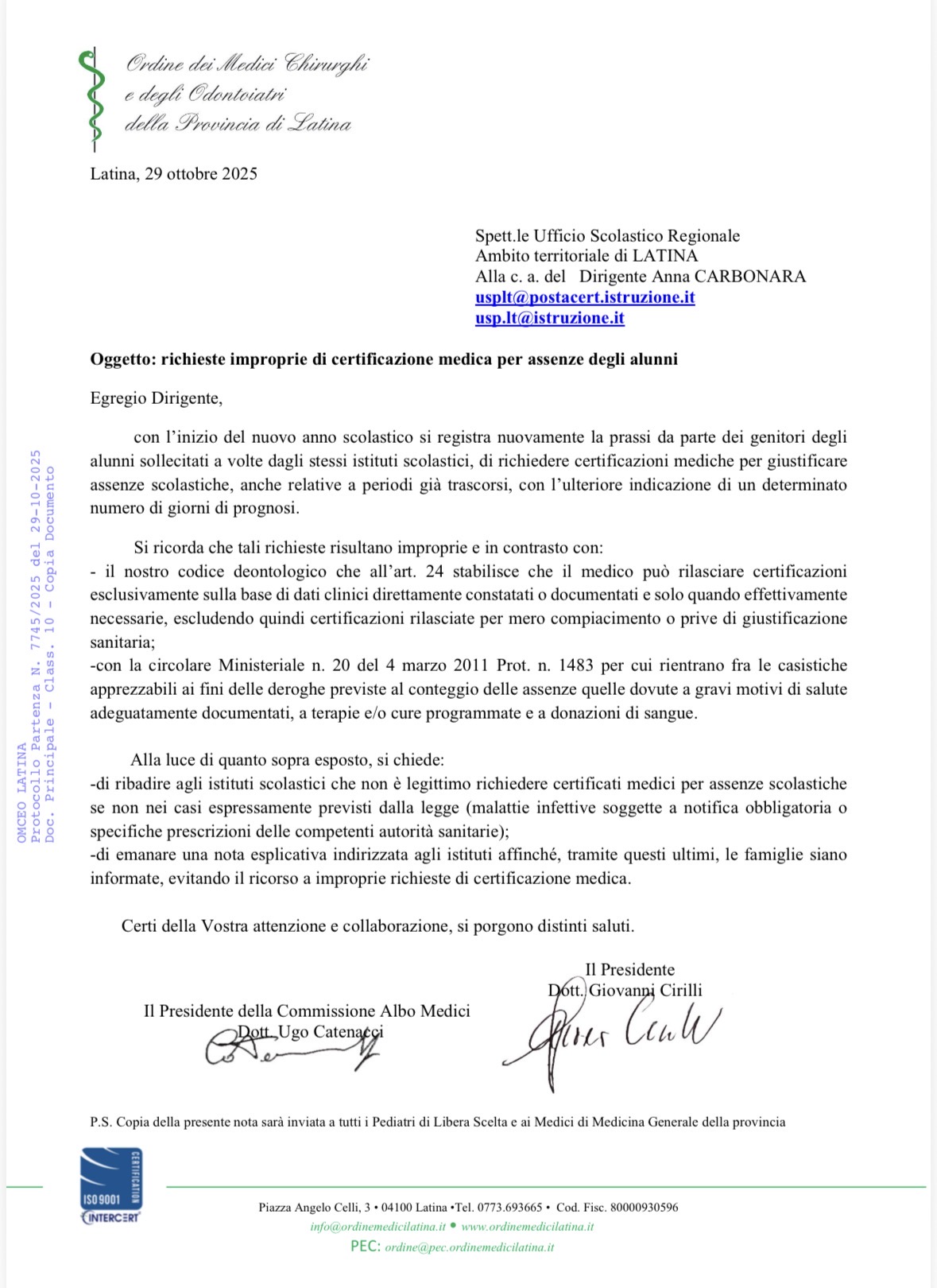 Riceviamo e pubblichiamo volentieri la lettera del Dottor Cirilli, Presidente dell’Ordine dei Medici di Latina, in cui si fa chiarezza sui certificati per il rientro a scuola. Consigliamo di stamparlo e di affiggerlo in sala d’attesa.